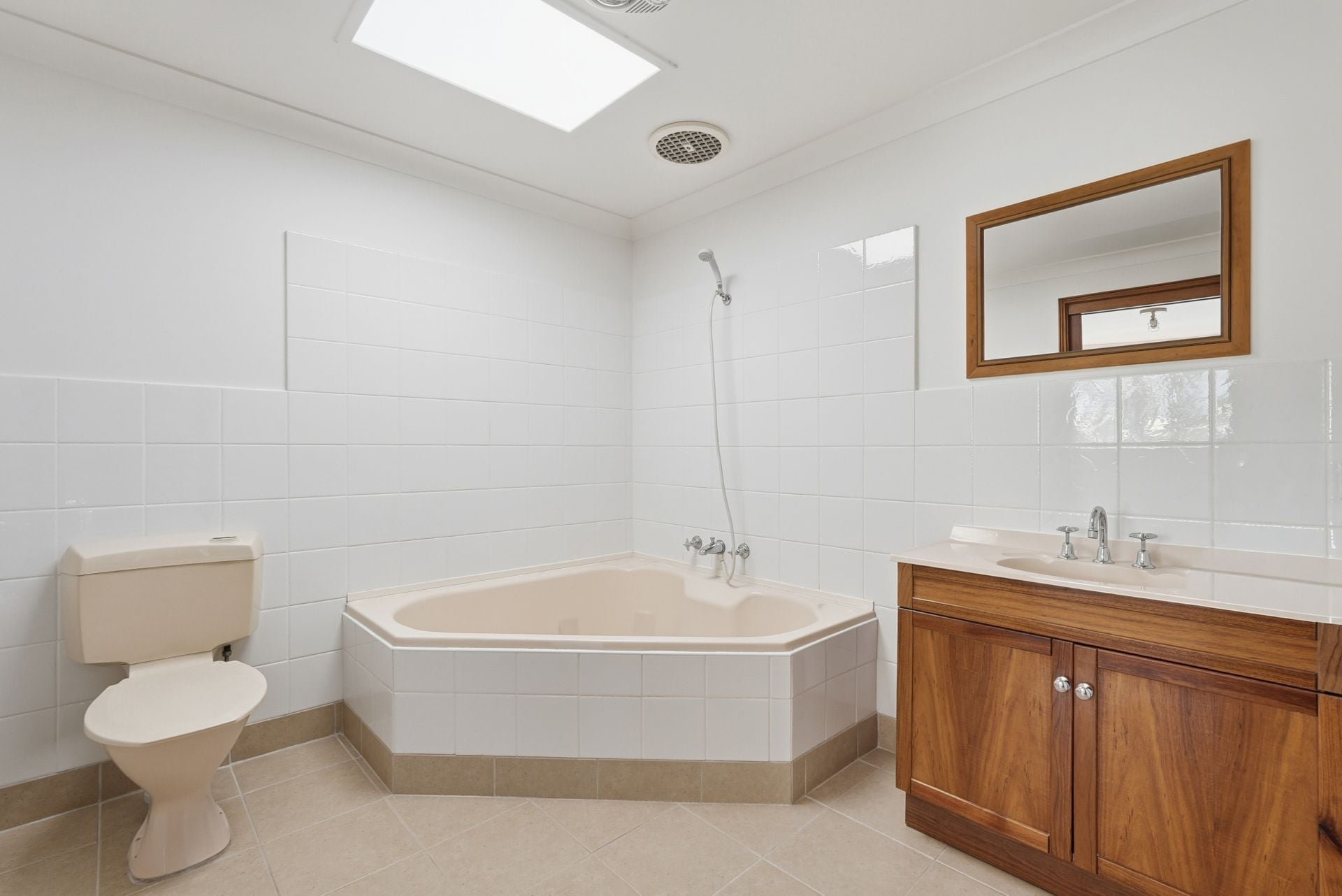 Master bathroom with corner bath and shower combined.