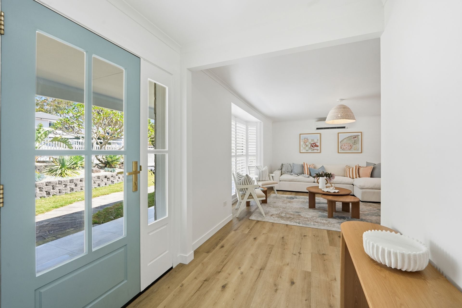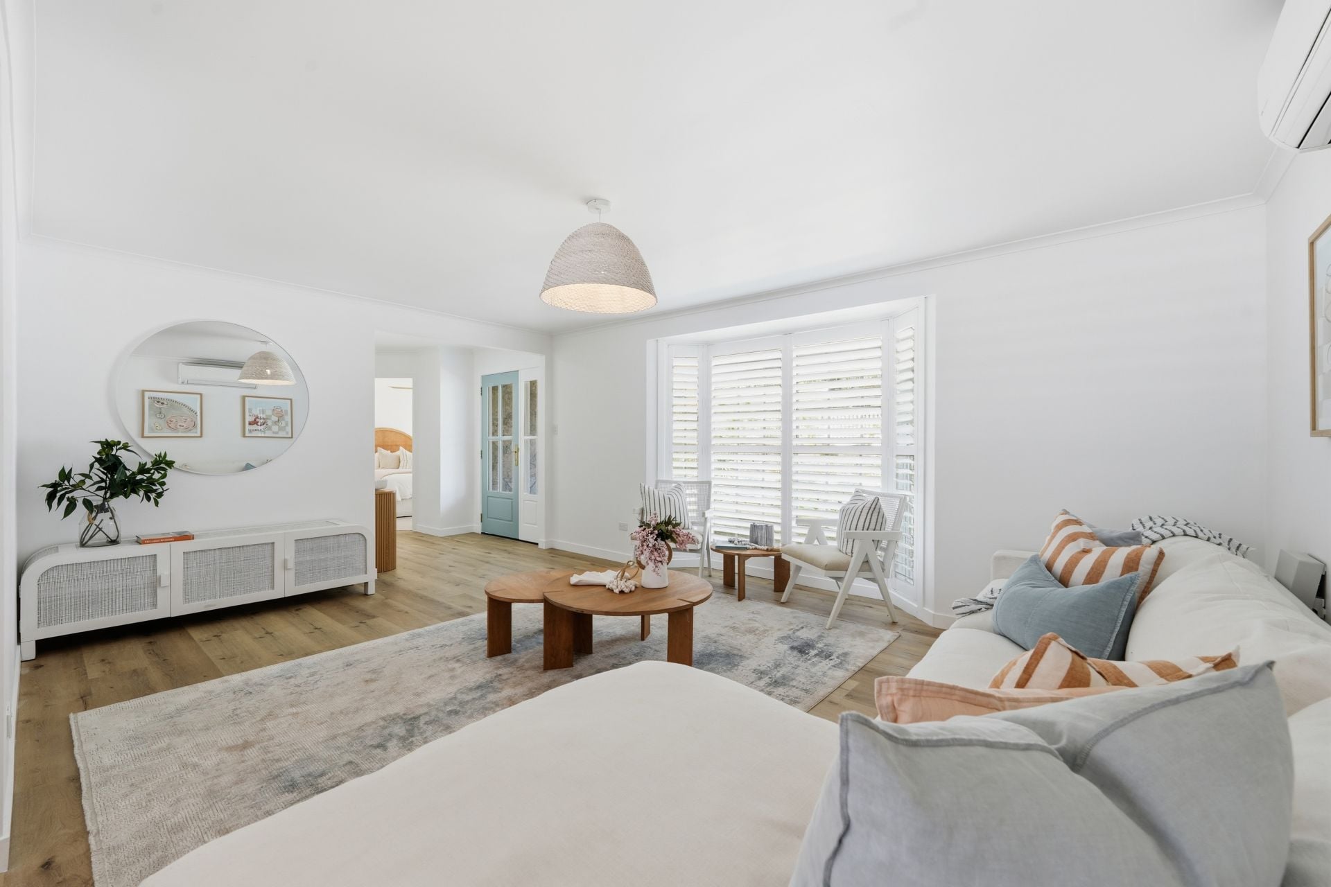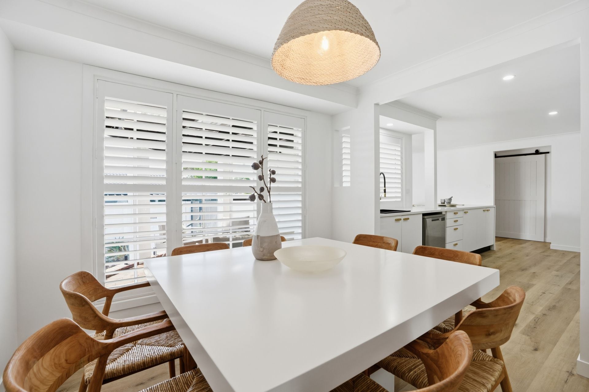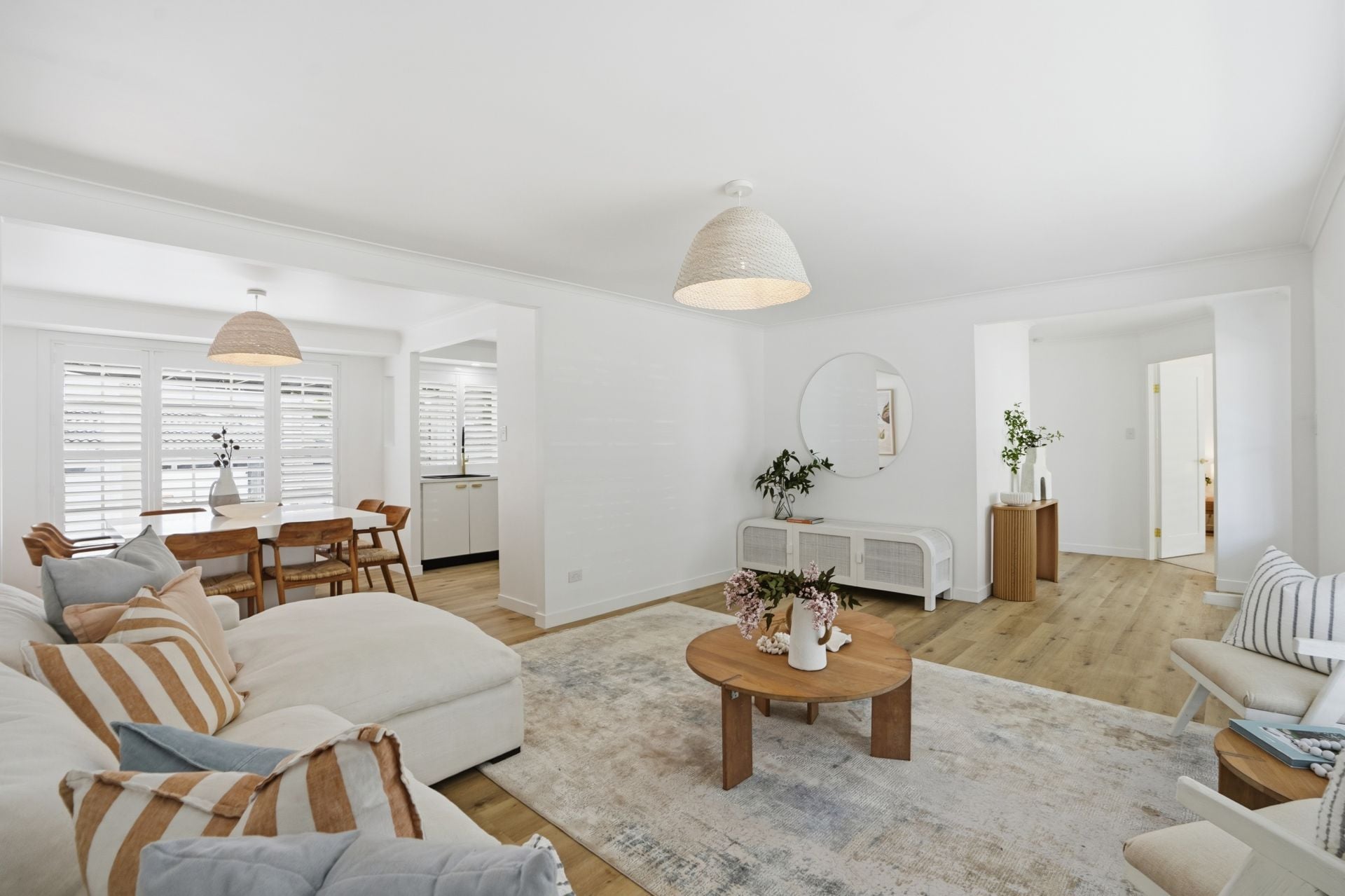 - Bright open-plan lounge and dining zones with plantation shutters