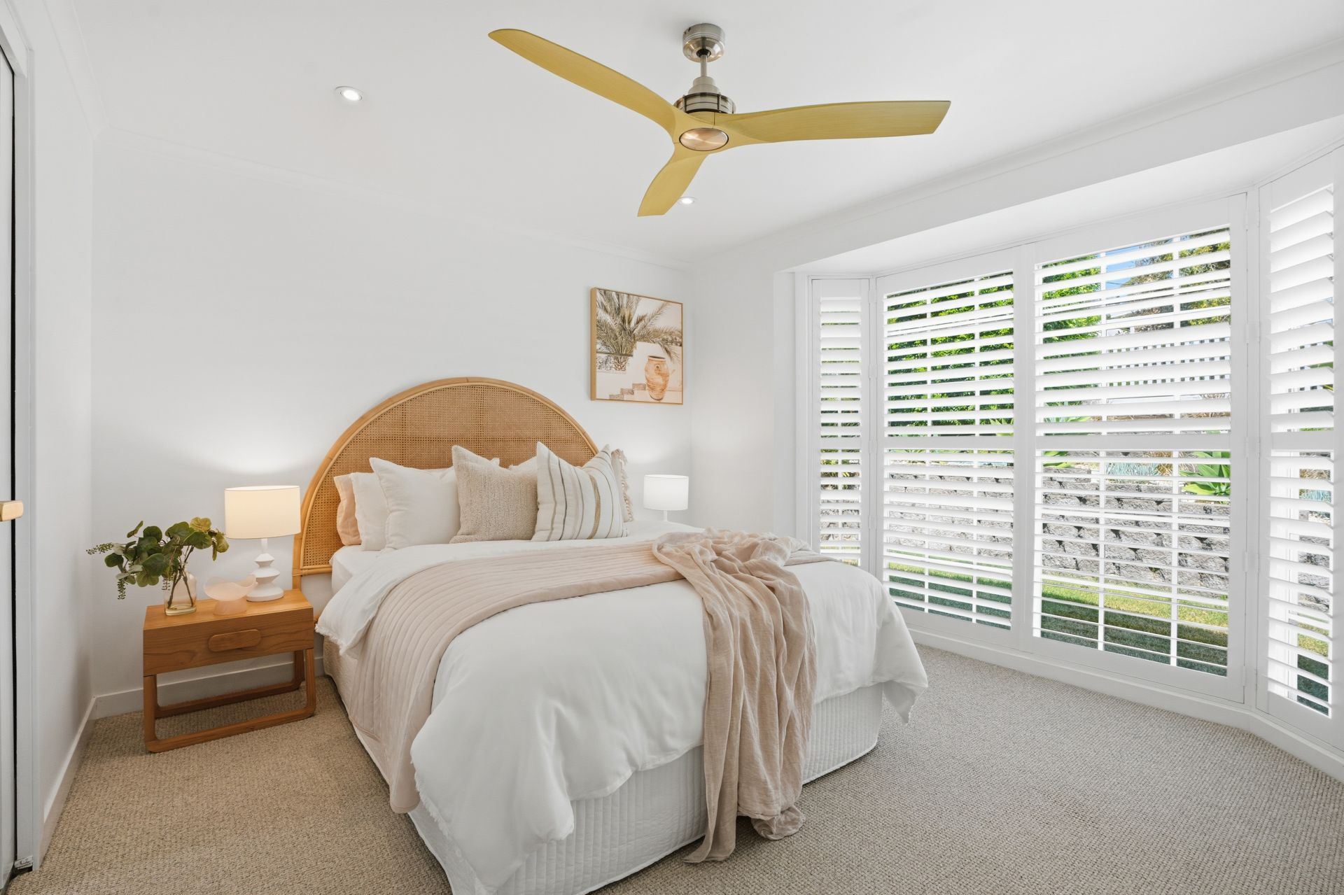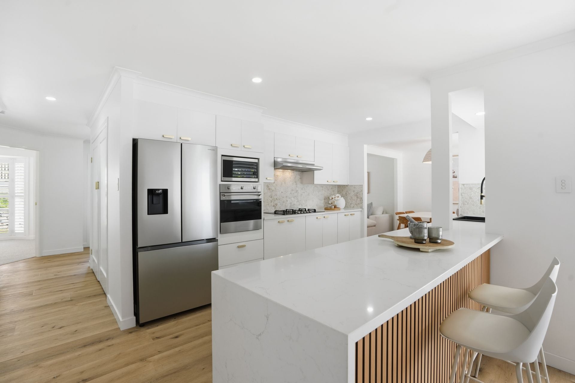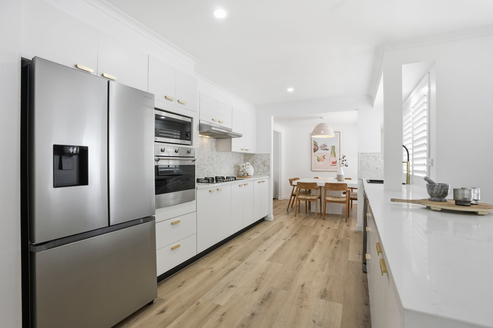 - Bright open-plan lounge and dining zones with plantation shutters