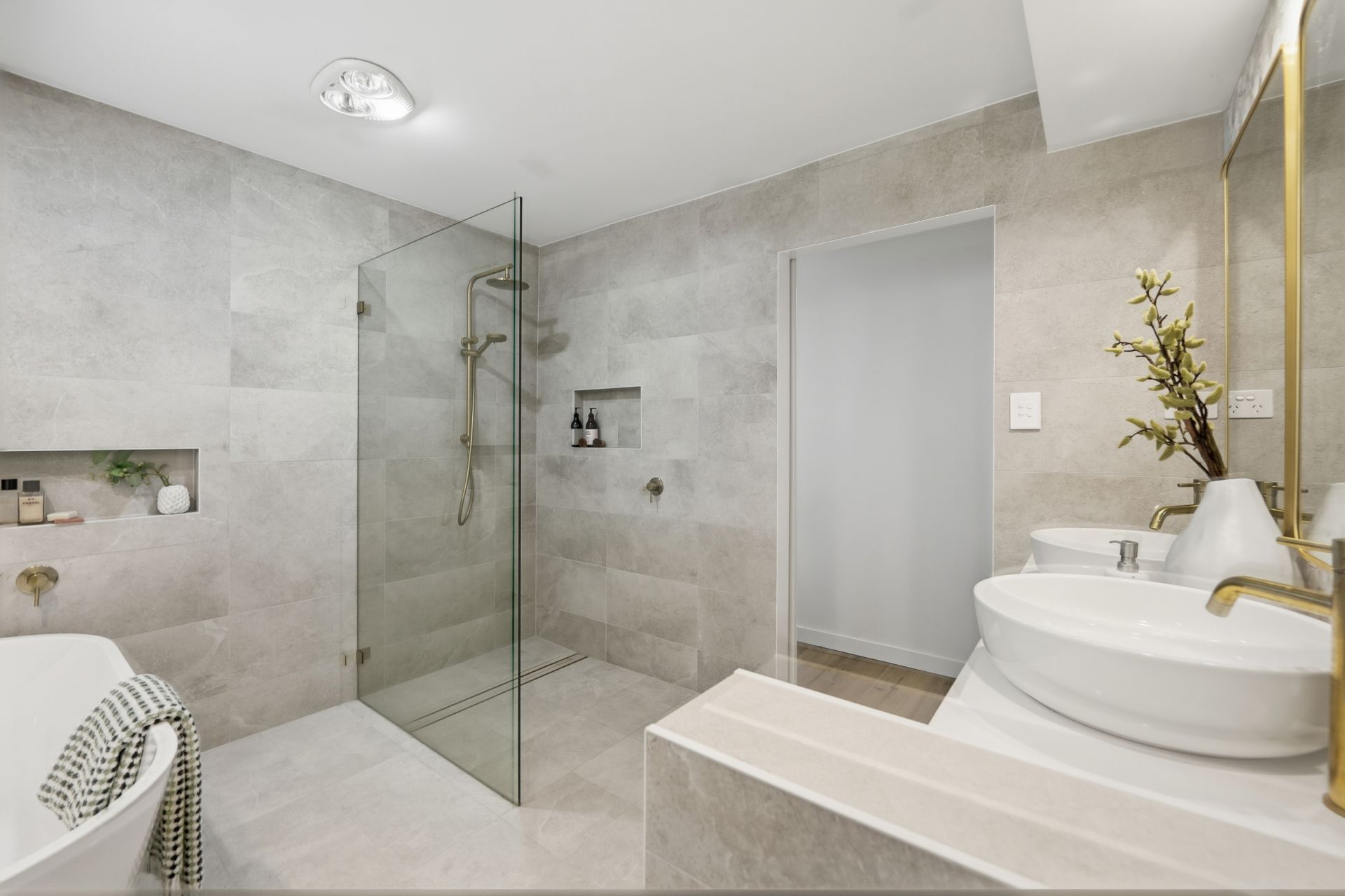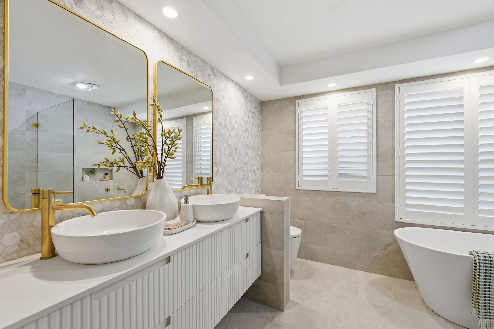 - Elegant bathrooms with stone accents and brushed-gold fittings