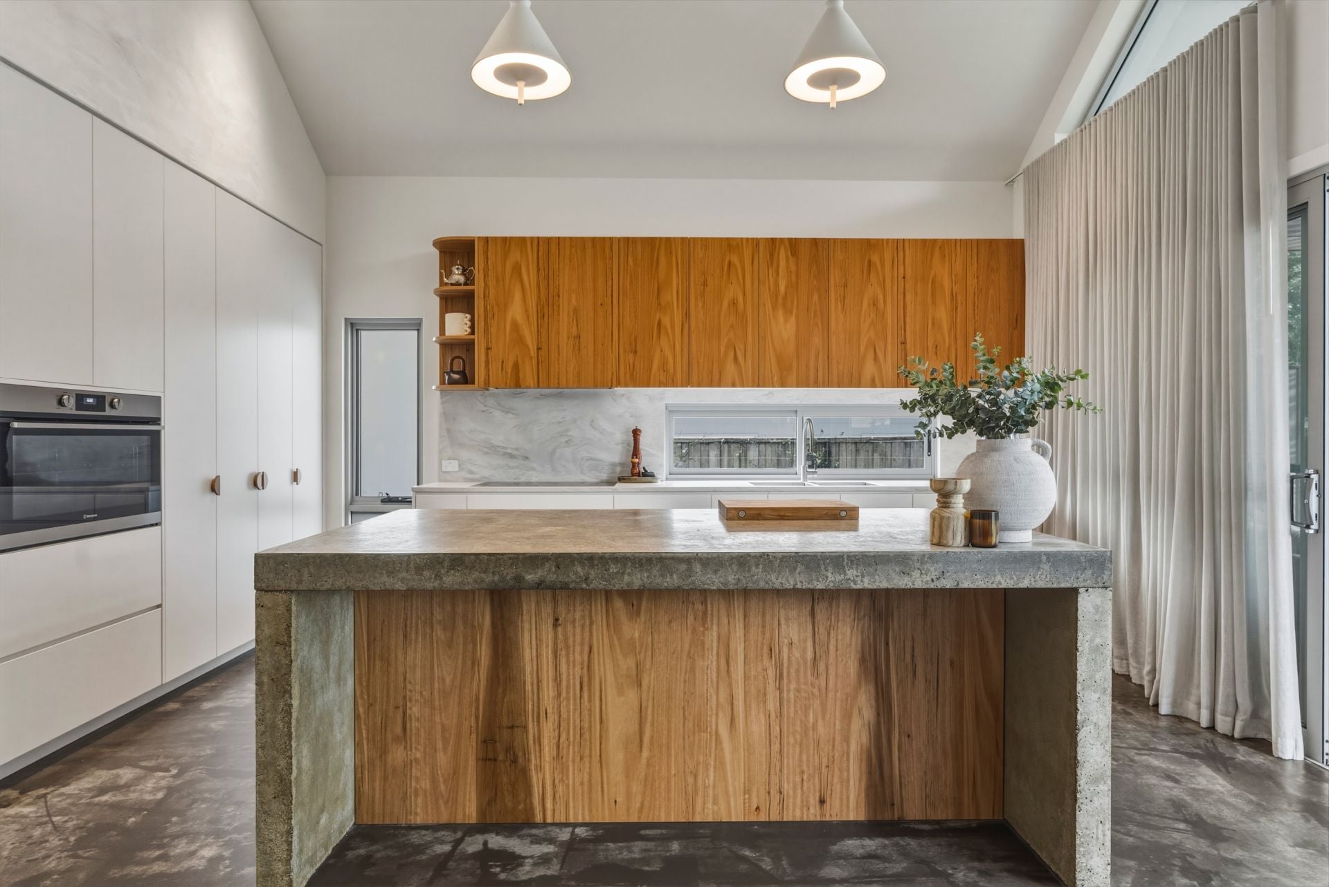- Architectural concrete island kitchen with custom joinery, integrated appliances and exceptional storage