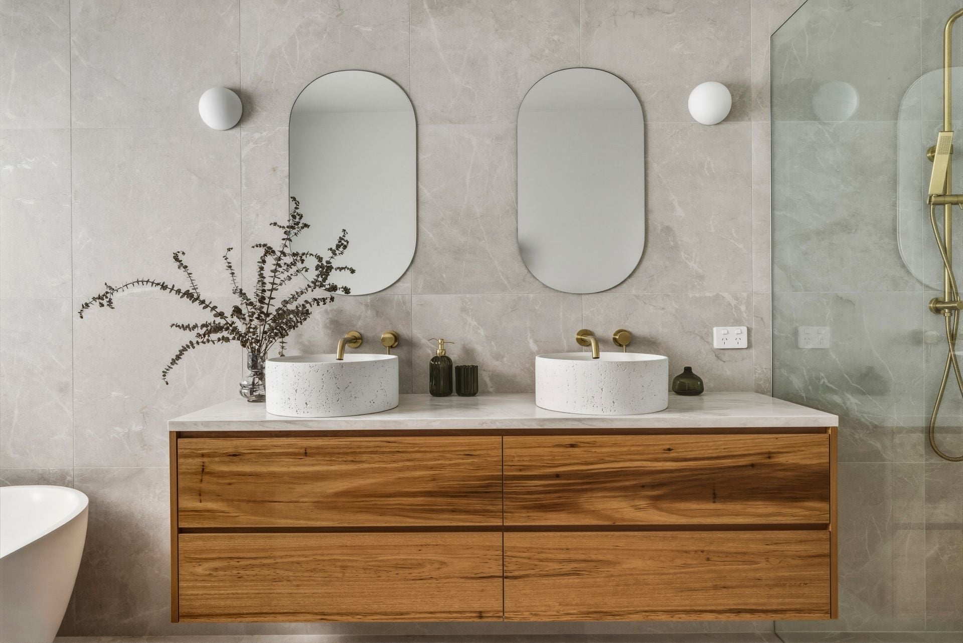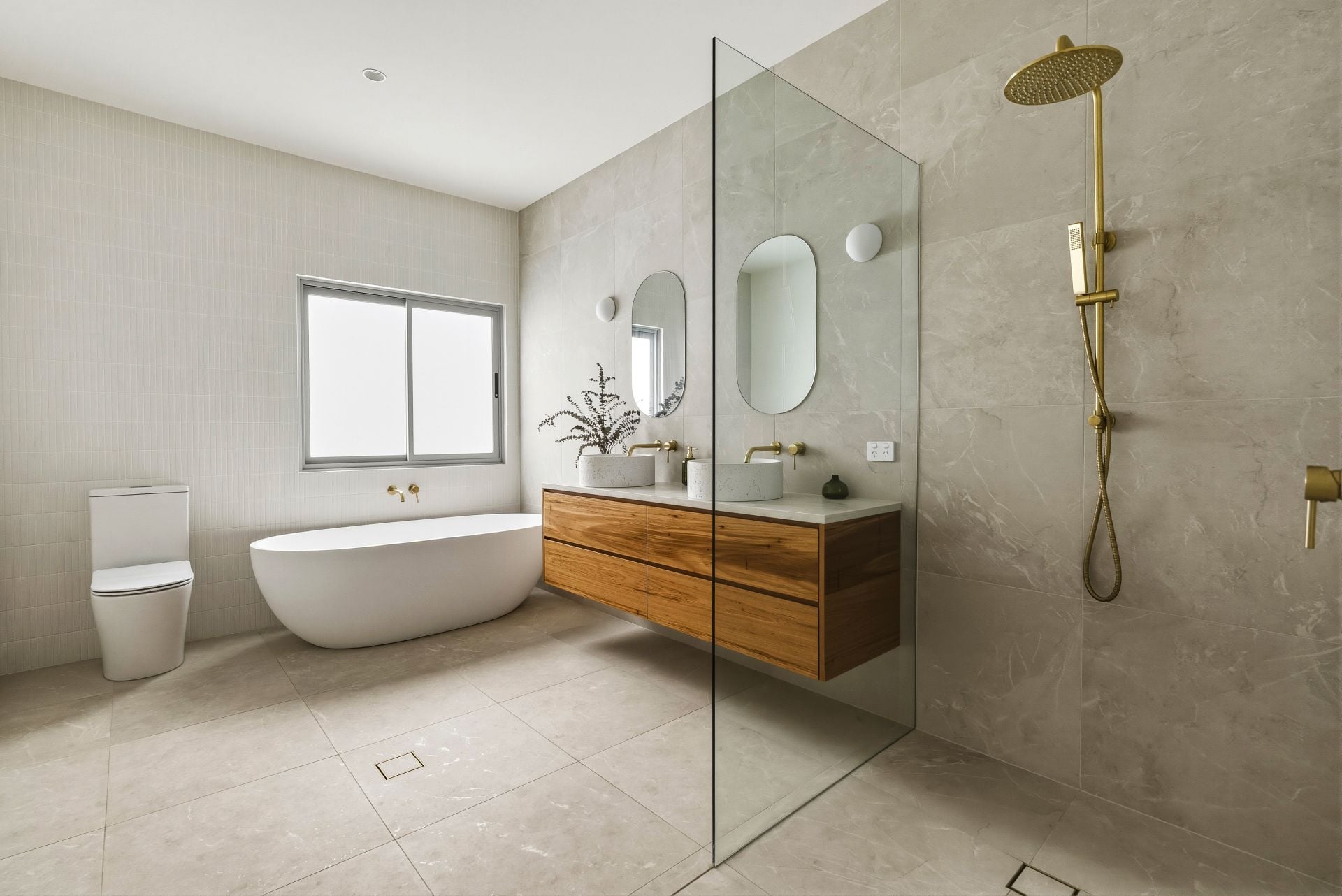 - Designer bathrooms with full height tiling, brushed brass fixtures and freestanding bath