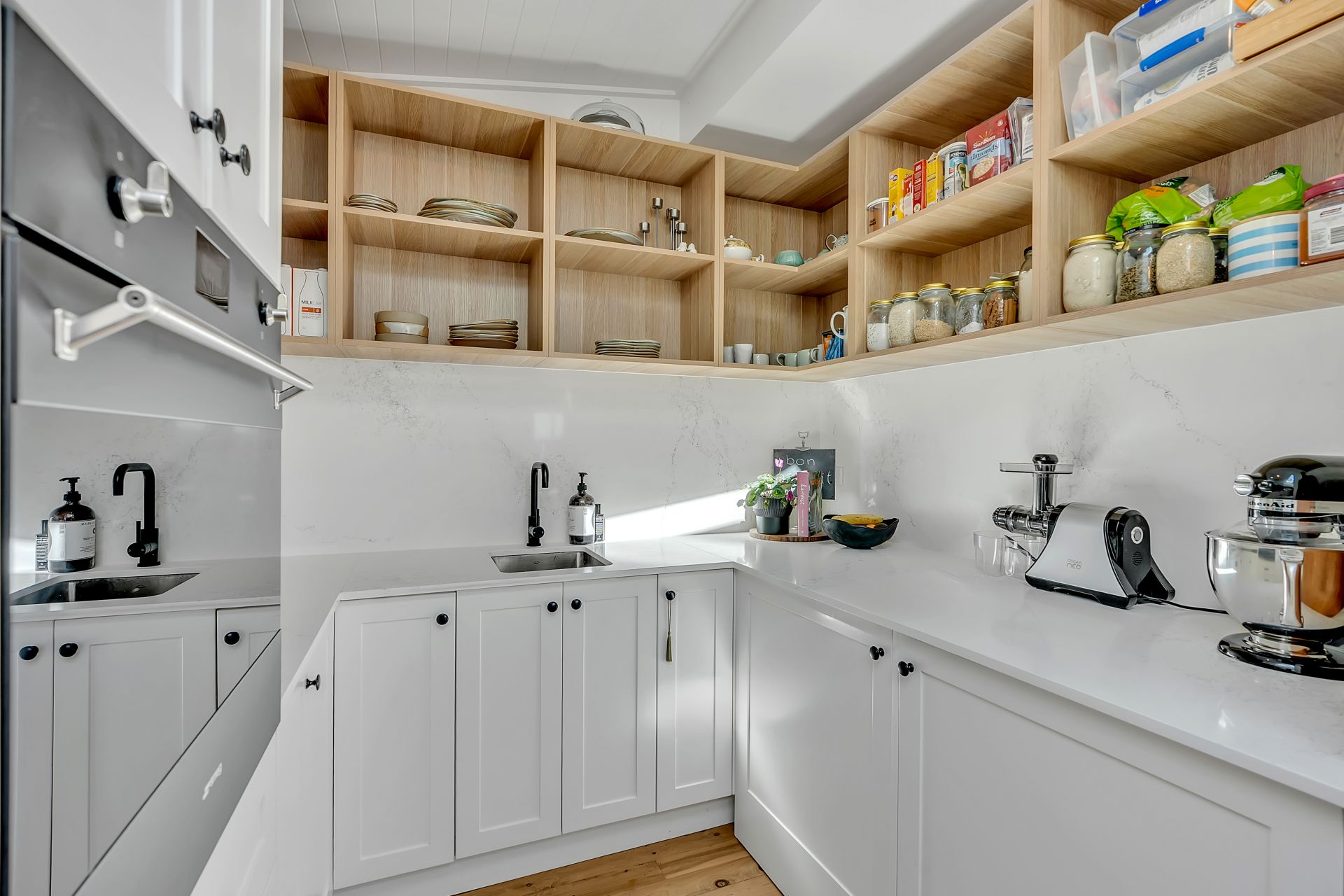 The gourmet kitchen is a chef's delight, featuring stone benchtops, high-end appliances, ample storage, and an entertainer's bench ideal for gatherings.