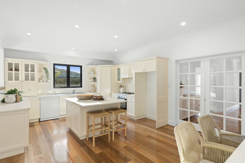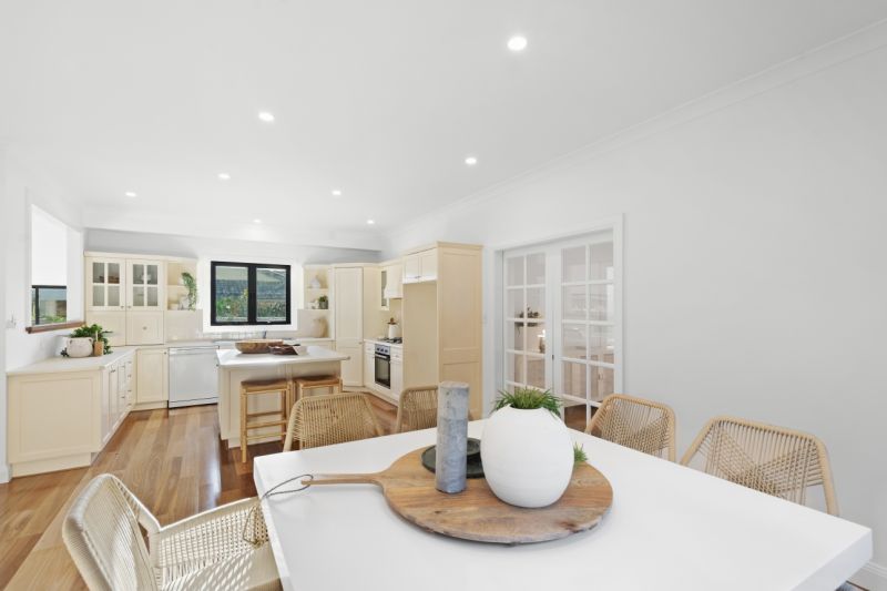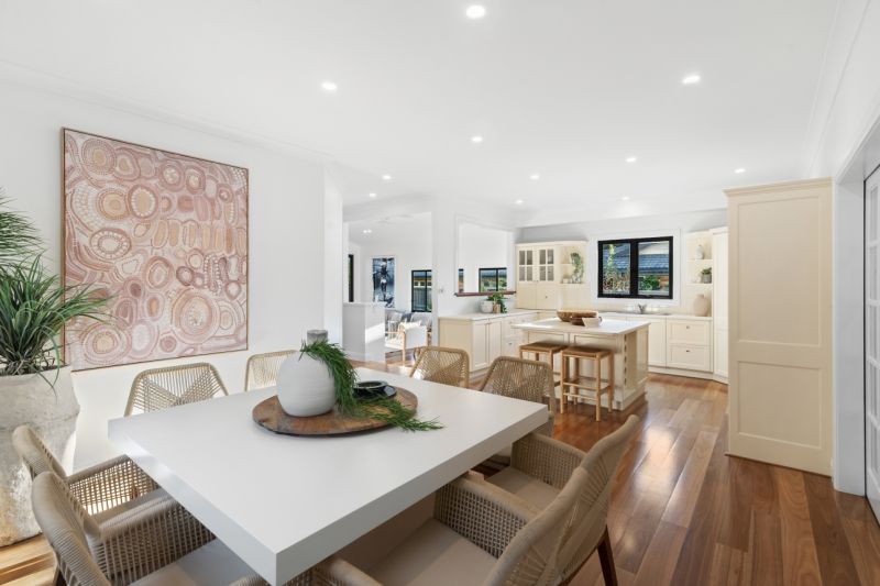 - Central kitchen with island bench and open dining room
