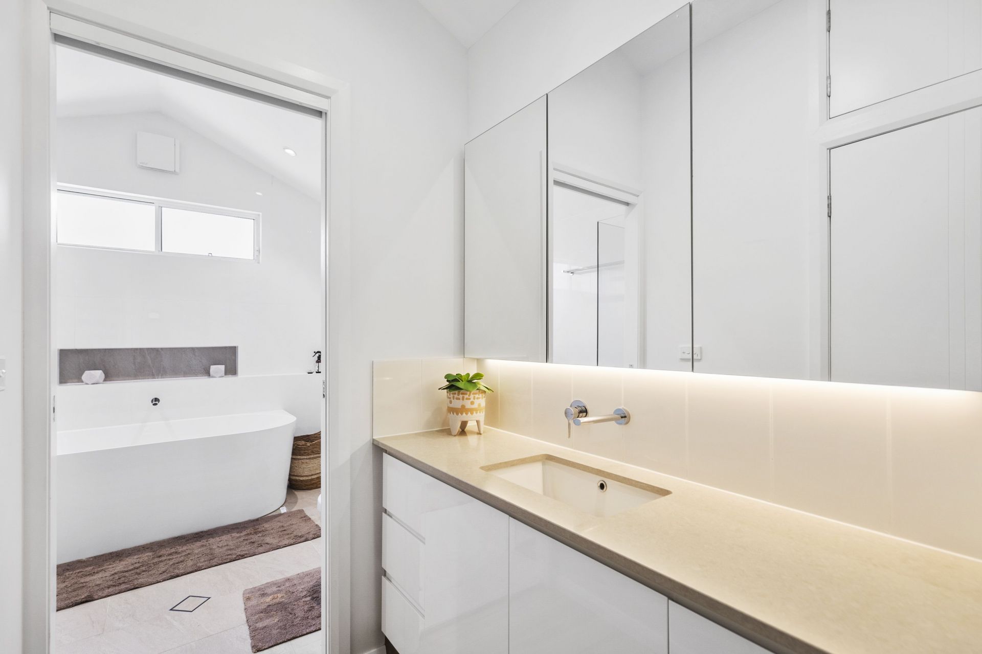 – Sleek main bathroom with freestanding tub and separate shower