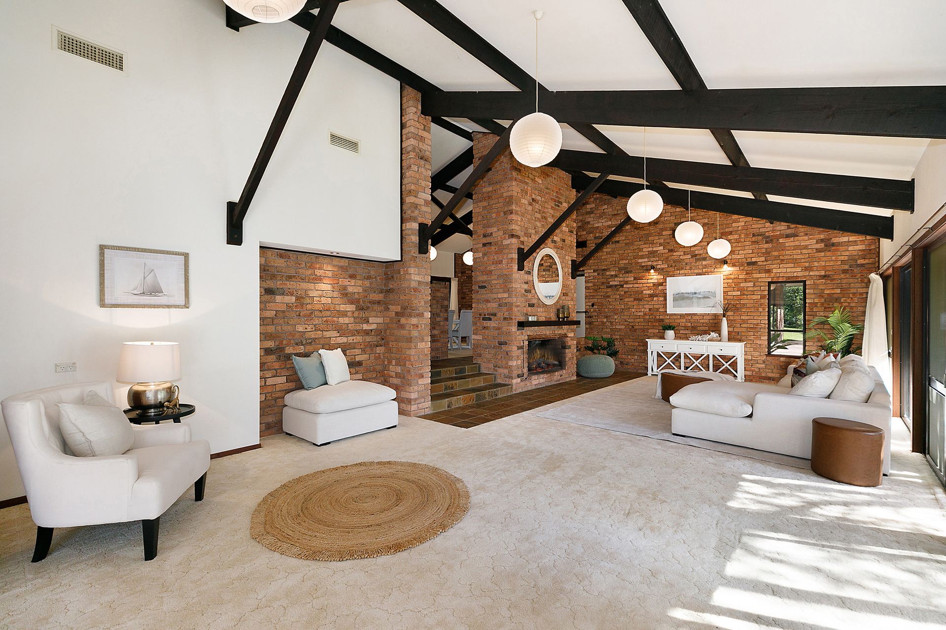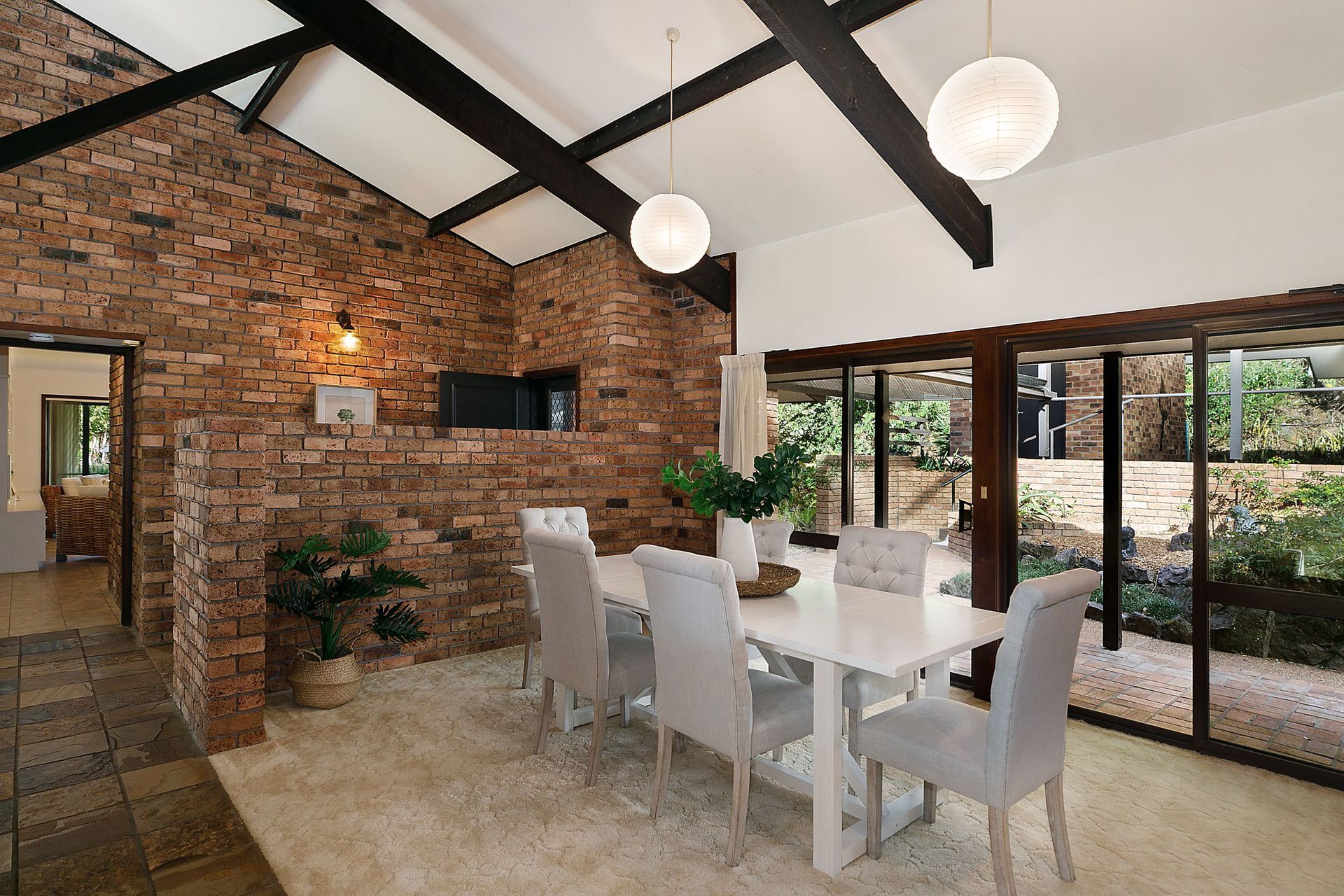 - Stunning exposed brick, high pitched ceilings, and a fireplace, create a country cottage feel