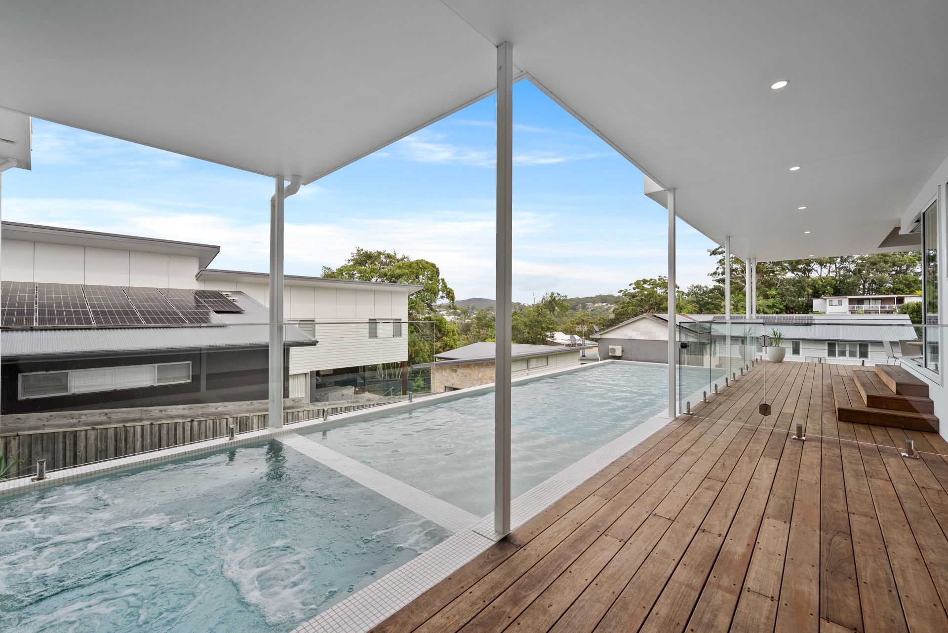 - Glass framed Mineral pool with spa positioned alongside the main living zone.